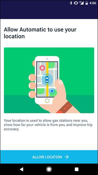 Em seguida, Automático pedirá permissão para usar a localização do seu telefone. Isso é usado para localizar postos de gasolina perto de você e medir a distância do seu carro. No entanto, isso não é usado para localizar onde seu carro está, pois o adaptador pode fazer isso sozinho.