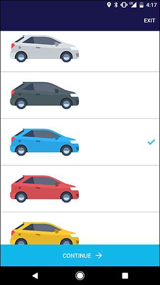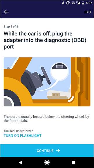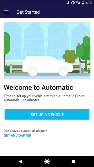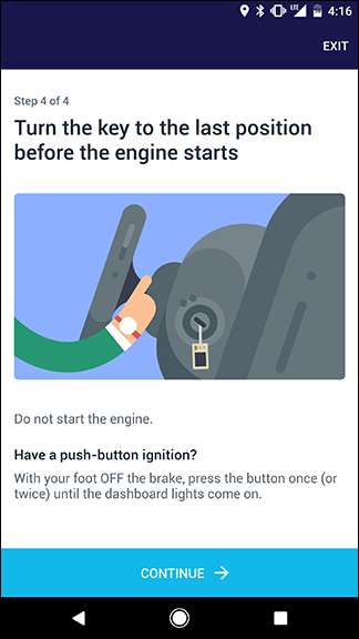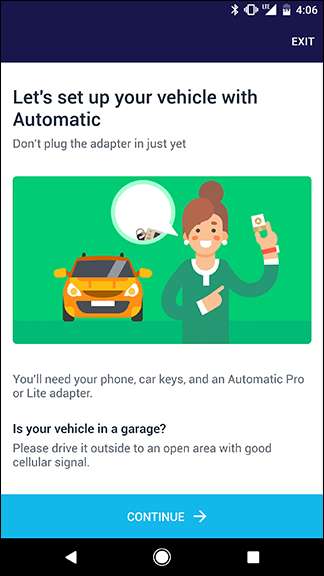Agora é hora de configurar um carro. Toque no botão azul “Configurar um veículo”. Este é um bom momento para pegar seu adaptador e ir para o carro que você está configurando (mas não conecte o adaptador ainda). Toque em Continuar quando estiver no carro.