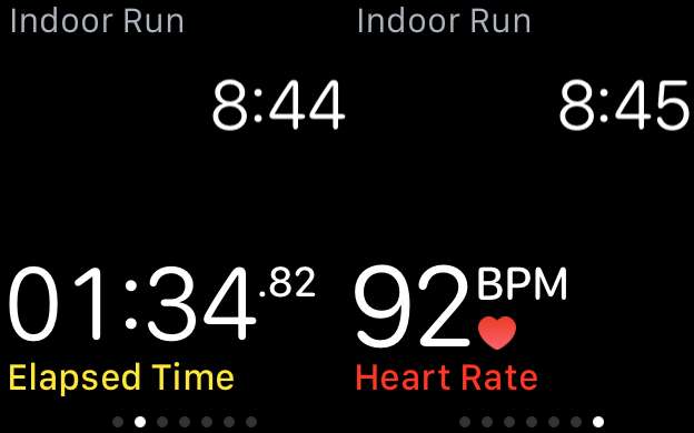 Quando estiver em um treino, você poderá monitorar o tempo decorrido, o ritmo atual, a distância, as calorias ativas, o total de calorias e a frequência cardíaca.