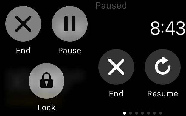 Quando você terminar seu treino ou precisar pausá-lo, simplesmente pressione a tela do relógio até ver as opções para encerrar, pausar e bloquear a tela.