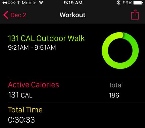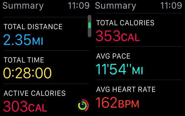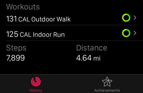 Os exercícios são divididos da mesma forma que quando você obtém um resumo no final de um. Você verá o total de calorias, calorias ativas e tempo total.
