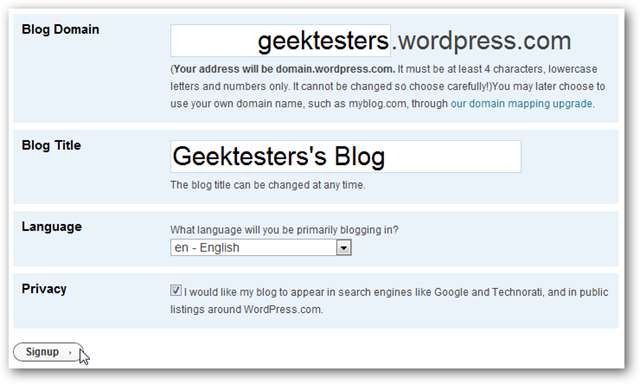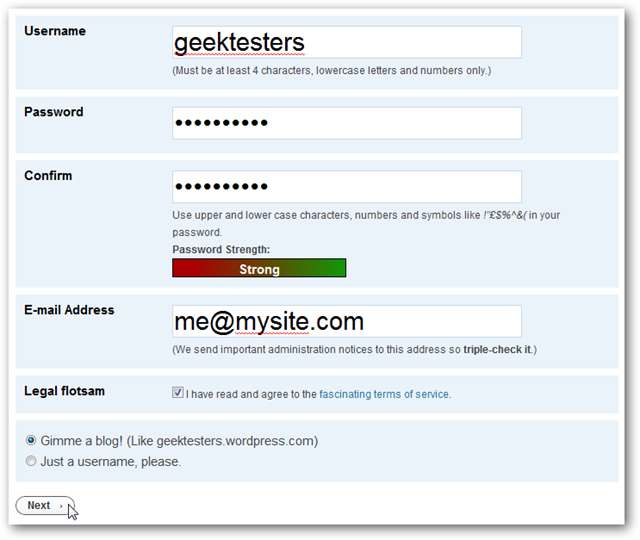 Insira um nome de usuário e senha, verifique se concorda com os termos legais, selecione o marcador “Gimme a blog” e clique em Next.