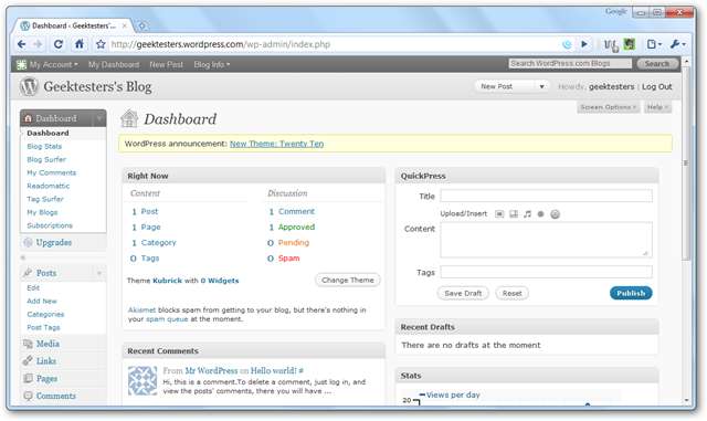 Ao entrar no seu blog do WordPress, você verá primeiro a página de administração do WordPress. Aqui você pode ver postagens e comentários recentes, e pode ver estatísticas de quantas pessoas visitaram seu site. Você também pode acessar todas as ferramentas e configurações do seu blog diretamente nesta página.