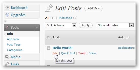 Para adicionar uma nova postagem ao seu blog, clique no link Postagens à esquerda e, em seguida, clique em “Adicionar novo” no menu à esquerda ou na parte superior da página Editar postagens. Ou, se quiser editar a primeira postagem padrão, passe o mouse sobre ela e selecione Editar.
