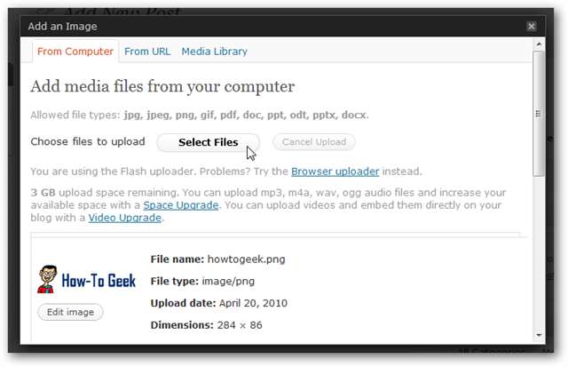 Para adicionar imagens ou outros arquivos, clique no ícone da imagem ao lado de “Carregar / Inserir”. Sua conta de blog gratuita pode armazenar até 3Gb de fotos e documentos, o que definitivamente será um bom começo.