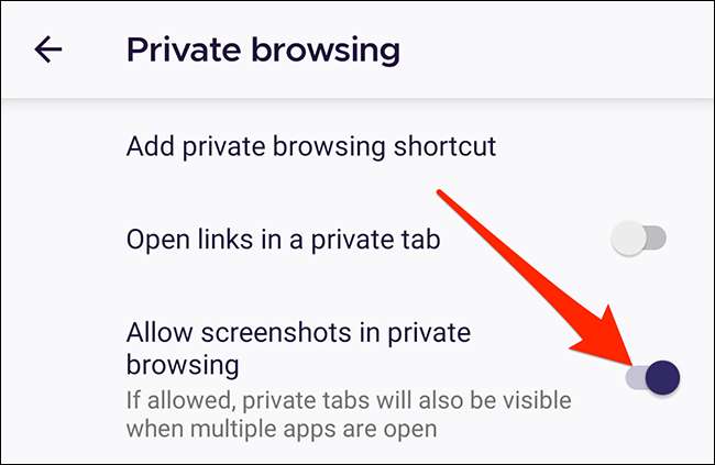 Alternar na opção "Permitir capturas de tela na opção Browsing Private".