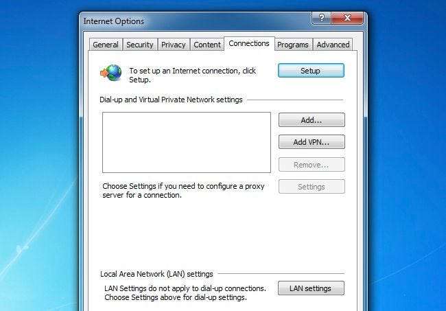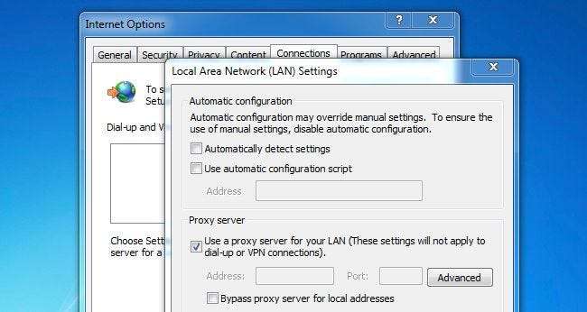 Supondo que você esteja usando quase qualquer versão do Windows, você pode apenas abrir o Internet Explorer e, em seguida, abrir as Opções da Internet. Vá para a guia Conexões e clique no botão Configurações de LAN na parte inferior.