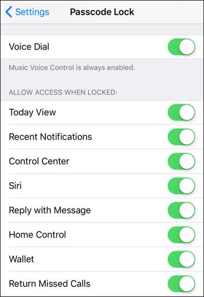 Não há necessidade de habilitar nenhuma configuração para aproveitar este recurso (nem você pode desabilitar o recurso). Embora, se você está pensando em segurança desta forma e deseja garantir que seu iPhone bloqueado não forneça nenhuma informação comprometedora, recomendamos que você acesse as configurações de bloqueio por senha, encontradas em Ajustes> Bloqueio por senha, para restringir ainda mais o que seu telefone pode fazer enquanto está bloqueado: