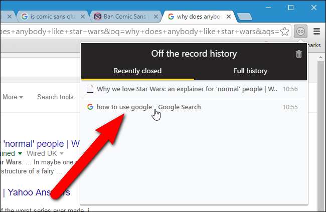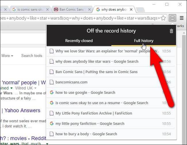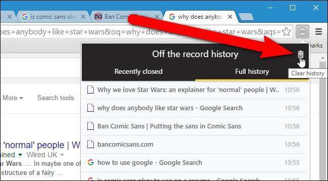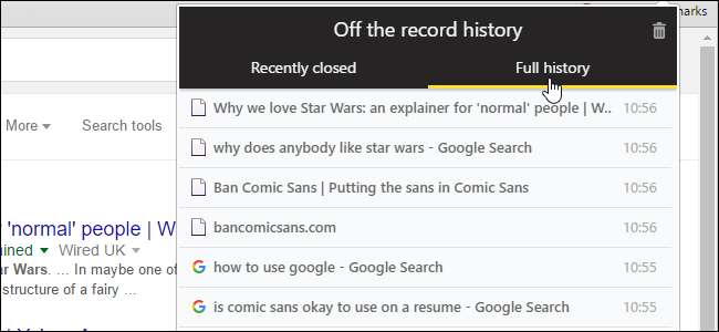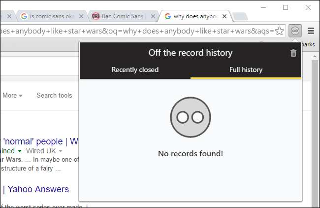 A extensão Off The Record History no Chrome mantém um histórico de sua sessão de navegação anônima atual. Você pode ver uma lista de links para todas as páginas da web que visitou e guias anônimas que fechou. Depois de fechar a janela anônima, todo o histórico é excluído.