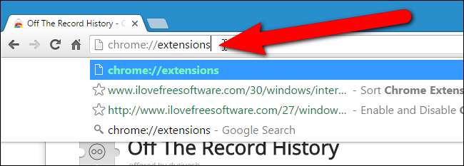 Para permitir que Off The Record History salve sua sessão de navegação em uma janela anônima, você deve ativar uma configuração para a extensão. Para fazer isso, digite chrome: // extensions na barra de endereço e pressione “Enter”.