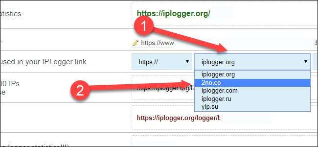 Para ocultar o que está fazendo, você pode usar um serviço de redução de URL. Infelizmente, esses serviços de redução não gostam dos URLs dos registradores de IP e geram erros. Para contornar isso, clique na lista suspensa iplogger.org à direita de “Selecione um nome de domínio” e escolha “2no.co” para seu domínio. O link de rastreamento na parte superior será atualizado, copie o novo link.