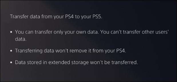 Quando você seleciona esta última opção, o PS5 mostrará mais informações sobre quais dados serão movidos do seu PS4 e dirá que não será removido do seu PS4.
