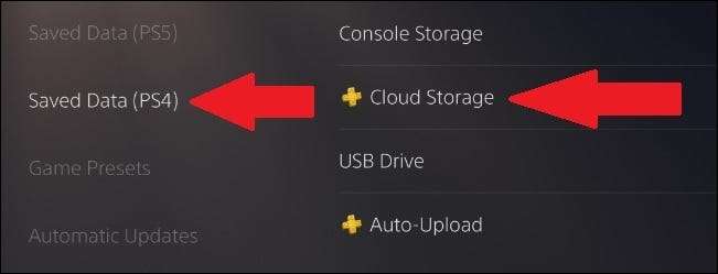 De lá, role para baixo para "Dados salvos (PS4)", selecione "Cloud Storage" no submenu. Vai ter um pequeno símbolo PS mais ao lado dele.