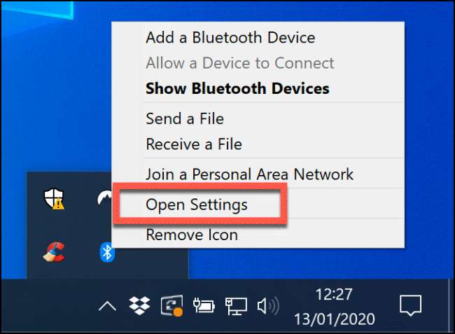 Para iniciar este processo, abra as configurações de Bluetooth no Windows. Se o ícone do Bluetooth estiver visível na barra de tarefas do Windows, clique com o botão direito nele e selecione “Abrir configurações”.