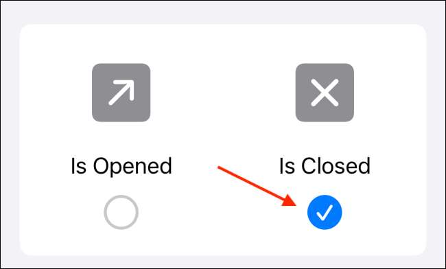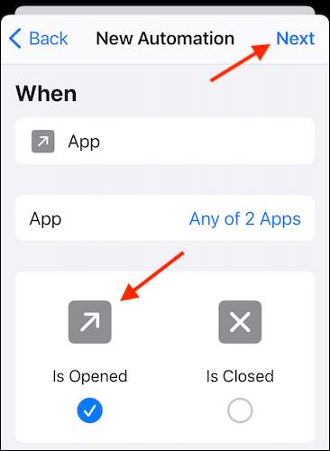 Certifique-se de que a opção "é aberta" esteja selecionada. Isso garante que a automação seja executada quando você abre os aplicativos selecionados. Em seguida, toque no botão "Next" a partir do topo.