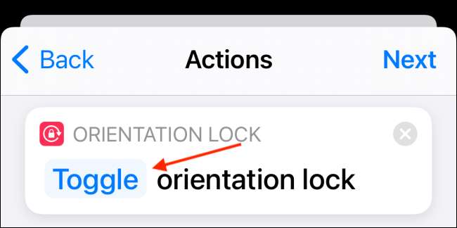 Por padrão, esta ação é definida para alternar o bloqueio de orientação. Mas queremos desativá-lo, então toque no botão "Toggle" para mais opções.