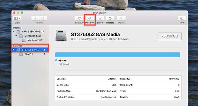 Na janela do Utilitário de Disco, selecione a unidade que você está usando para backups do Time Machine e clique no botão Partição na barra de ferramentas.