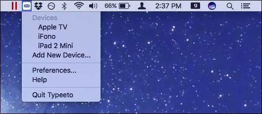 Conforme você emparelha mais dispositivos ao seu Mac, a lista de dispositivos disponíveis do Typeeto aumentará. Sempre que quiser mudar para um dispositivo diferente, clique no ícone na barra de menu e selecione-o.