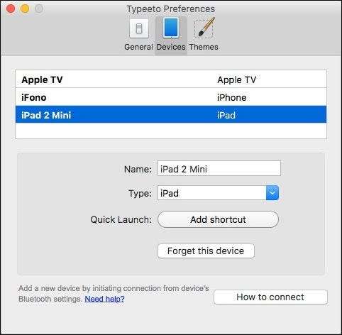 Você pode gerenciar qualquer dispositivo que tenha emparelhado com seu Mac e posteriormente usado com o Typeeto, como renomeá-lo, adicionar atalhos de teclado de início rápido (muito útil para alternar rapidamente) e a capacidade de esquecer dispositivos.