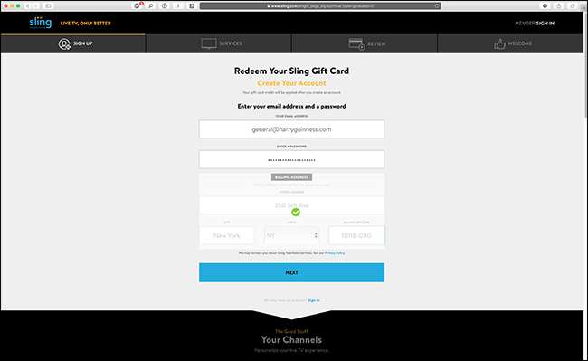 Agora que você configurou uma VPN para acessar as ofertas da Sling nos Estados Unidos e tem uma maneira de pagar, acesse a página de resgate de presentes da SlingTV . Clique em “Novo usuário? Resgate aqui ”e configure sua conta.