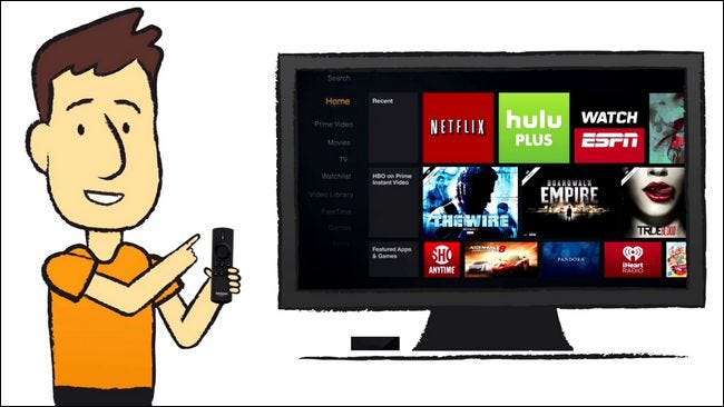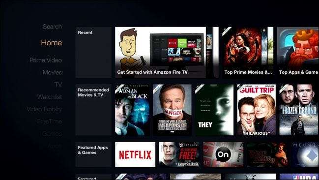 A interface do usuário no Amazon Fire é básica, mas eficaz (quando se trata de caixas de streaming básicas e fáceis de navegar, está tudo bem para nós). Depois de terminar a configuração e assistir ao vídeo tutorial, você é levado para a tela inicial.
