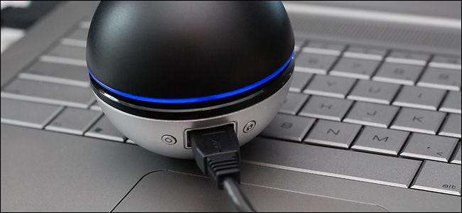 O anel indicador ao redor do centro da esfera fornece feedback imediato: escuro indica que não há energia, piscando indica que não há conexão e sólido indica que tudo está pronto para funcionar e o dispositivo está conectado com êxito a uma rede Wi-Fi. Se a luz indicadora for muito brilhante ou irritante (pensamos que era sutil e agradável, mas você pode discordar se ela está iluminando seu quarto à noite), você pode pressionar o botão LED, localizado à esquerda do plugue USB na foto acima, para desligá-lo.