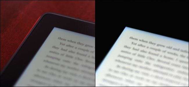 Ao ler um livro do Kindle em que a tela inteira, exceto pelo texto, é totalmente branca, parece que há um halo azul ao redor da página inteira. Talvez algumas pessoas nunca notem, ou se notarem, não se importarão, mas uma vez que percebemos, não poderíamos Pare percebendo isso. As fotografias acima mostram o sangramento de luz sob condições de iluminação interna e em uma sala escura.