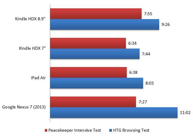 O Kindle HDX 8 ″ se saiu significativamente melhor do que o iPad air e o Kindle HDX 7 ″ se saiu tão bem quanto o iPad Air. Todos os três dispositivos se saíram pior do que o Google Nexus 7, que, para ser justo, é bem conhecido por ter uma grande duração de bateria.