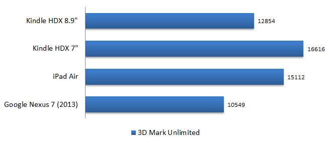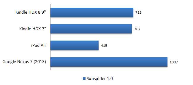 O Kindles se saiu moderadamente bem com o Kindle HDX 7 ″, por padrão de ter uma tela menor para enviar pixels, ultrapassou um pouco o modelo maior de 8,9 ″. O iPad air teve um desempenho duas vezes melhor no teste.