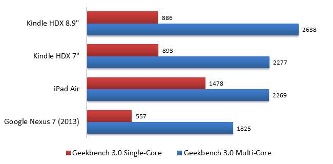 Os resultados aqui foram interessantes porque as unidades HDX tiveram desempenho pior do que o iPad Air quando se tratava de processamento single-core, mas no teste multi-core o HDX 7 ″ teve desempenho semelhante e o HDX 8.9 ″ se saiu significativamente melhor.