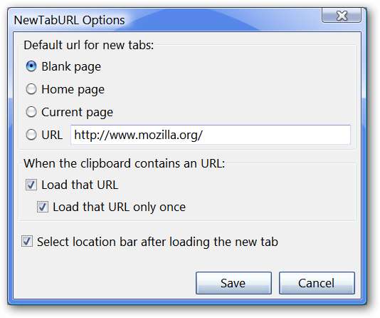 Como você pode ver, você pode escolher a página ou URL específica a ser carregada quando uma nova guia for aberta. Um dos recursos mais interessantes desta extensão é a capacidade de carregar uma URL que está na área de transferência do Windows assim que você abre uma nova guia ( muito conveniente! ) Observe que você pode fazer com que a extensão use esse URL específico apenas uma vez ou mais de uma vez.