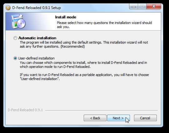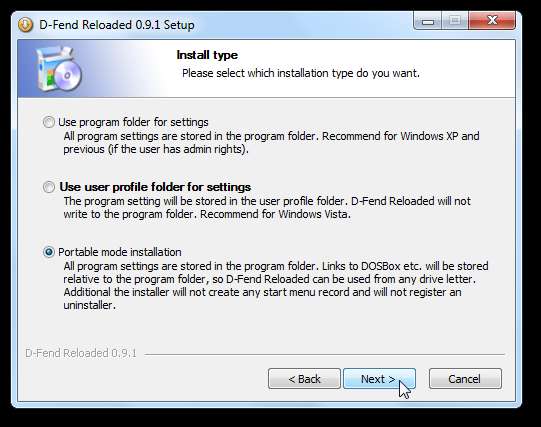 D-Fend Reloaded também pode ser instalado como um aplicativo portátil, para que você possa executá-lo a partir de uma unidade flash em qualquer computador Windows, selecionando Instalação definida pelo usuário .