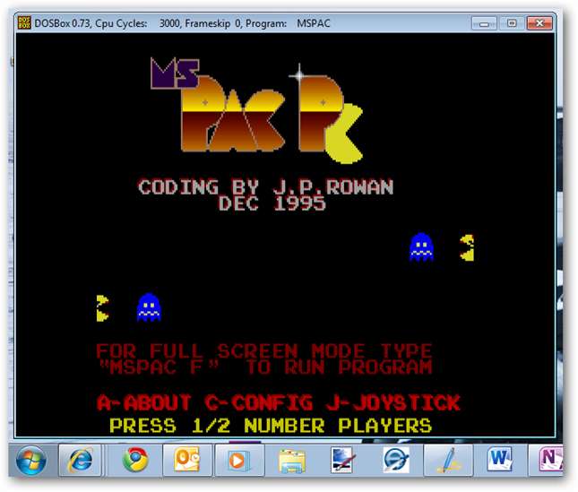 Aqui estamos executando Ms. PacPC, um remake do clássico jogo Ms. Pac-Man, em modo de tela inteira. Todos os recursos funcionam automaticamente, incluindo som, e você nunca precisa configurar nada na linha de comando do DOS - ele simplesmente funciona.