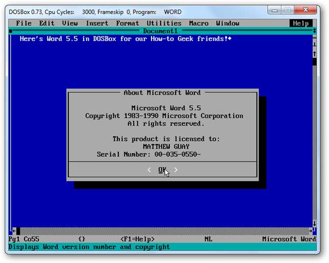 Você pode executar o aplicativo DOS com a mesma facilidade. Aqui está o Word 5.5 rodando no DOSBox através do D-Fend Reloaded ...