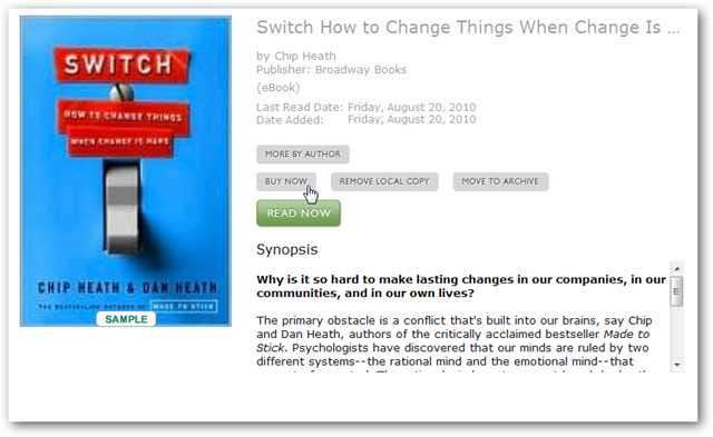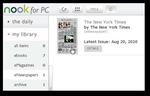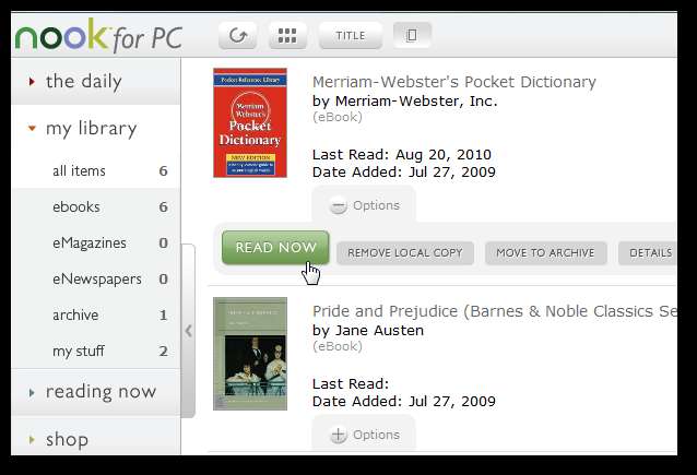 Depois de obter alguns livros, você pode lê-los no minha biblioteca link na barra lateral esquerda do Nook para PC. Clique Leia agora para começar a ler um livro, ou você pode escolher ver mais detalhes sobre o livro ou arquivá-lo.