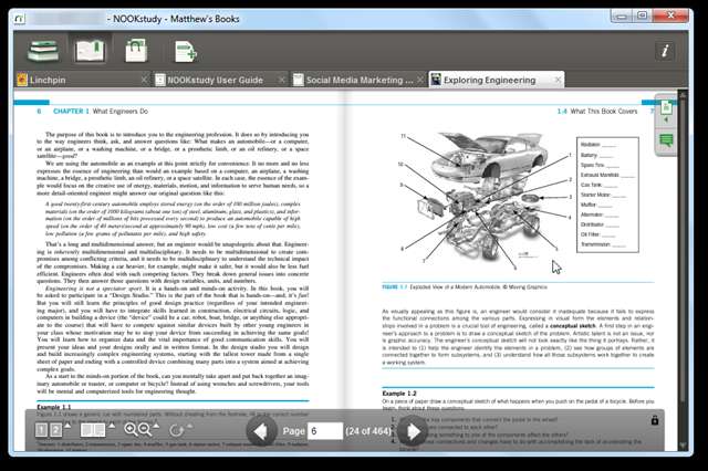Aqui está um livro aberto no estudo NOOK. Você pode ver 2 páginas ao mesmo tempo, como faria em um livro de papel, e pode ver fotos coloridas, diagramas e muito mais diretamente no seu computador.