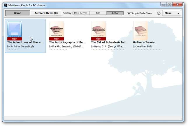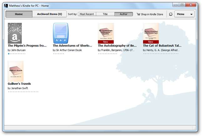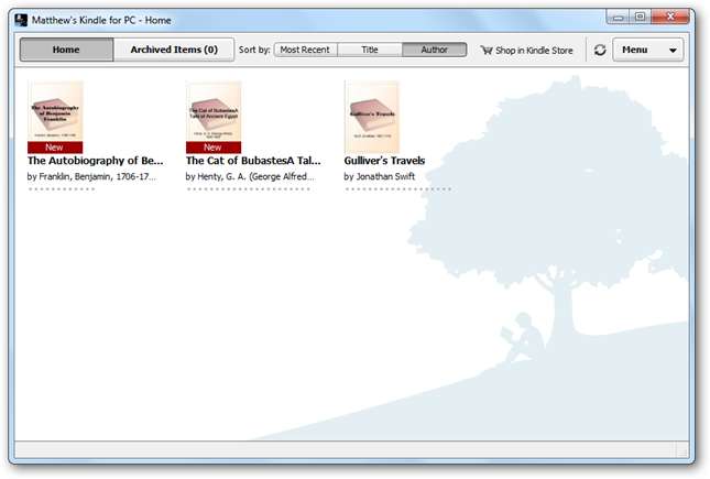 Agora, feche e reabra o Kindle para PC. Agora, ele deve mostrar seu novo e-book ao lado dos e-books que você baixou da Kindle Store.