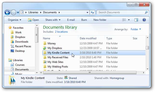 Em vez disso, navegue até a pasta Documentos (simplesmente clique no link Documentos no menu Iniciar) e clique duas vezes na pasta Meu conteúdo Kindle.
