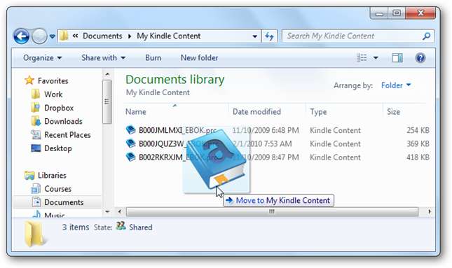 Esta pasta contém todos os livros do Kindle que você baixou. Se você tiver outros eBooks que gostaria de adicionar ao Kindle para PC, simplesmente arraste e solte ou copie e cole-os nesta pasta. Aqui temos um livro formatado .mobi baixado do Projeto Gutenberg que estamos arrastando para a pasta.