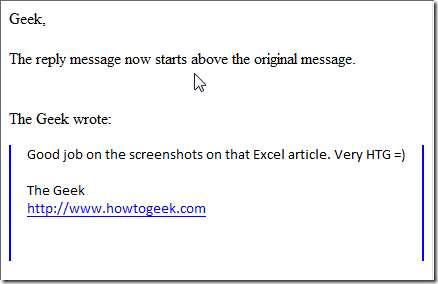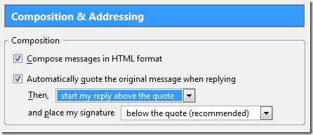 Em Configurações da conta, selecione Composição e endereçamento. Altere a caixa suspensa para “Comece minha resposta acima da citação”. Aqui você também pode escolher onde sua assinatura será exibida na mensagem. Quando terminar, clique em OK e volte para a mensagem original.