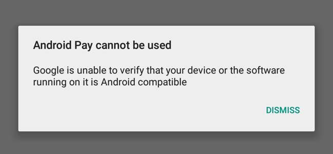 A solução de pagamento móvel Android Pay do Google não funciona em dispositivos Android com acesso root. Tente iniciá-lo e você verá apenas uma mensagem dizendo “O Android Pay não pode ser usado. O Google não conseguiu verificar se o seu dispositivo ou software executado nele é compatível com o Android. ”