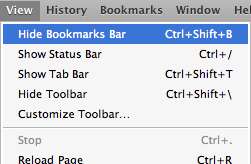 Para ocultar este menu é simples, basta abrir o navegador Safari da Apple, clicar em Exibir e selecionar Ocultar barra de favoritos.