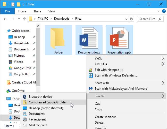 Você pode criar um arquivo ZIP de dentro do File Explorer sem baixar nada. Para fazer isso, selecione um ou mais arquivos ou pastas. Clique com o botão direito do mouse e escolha Enviar para> Pasta compactada (compactada).