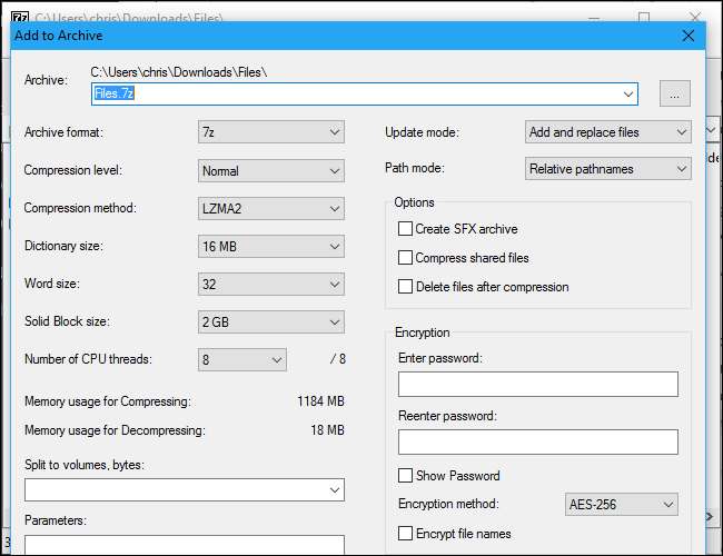 Ao criar um arquivo usando o botão “Adicionar”, ou a partir do menu 7-Zip no gerenciador de arquivos, você encontrará muito mais opções - uma escolha de formato de arquivo, um nível de compressão (um nível mais alto resulta em arquivos menores, mas leva mais tempo e recursos da CPU para criar e posteriormente extrair o arquivo) e uma senha de criptografia. Selecione a criptografia AES-256 e seus arquivos serão criptografados com a senha de sua escolha. Qualquer pessoa que tiver acesso ao arquivo precisará da senha para desbloqueá-lo ou não poderá ver seus arquivos.