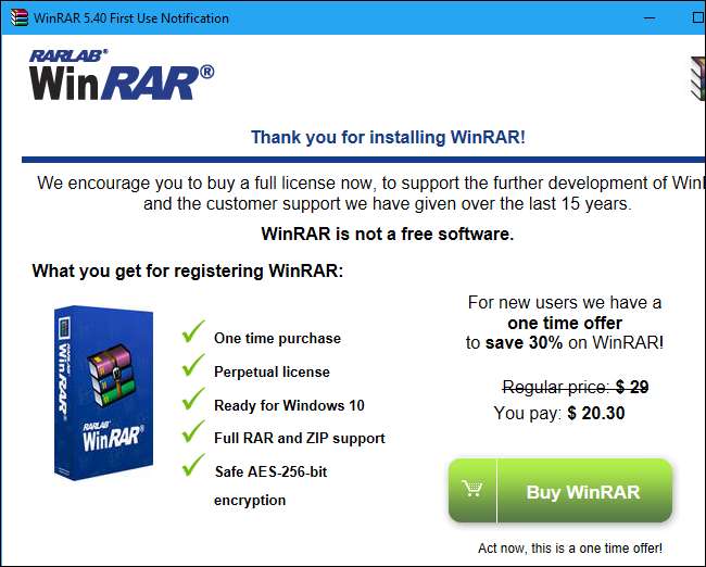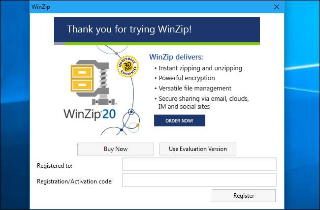 O WinZip e o WinRAR oferecem testes gratuitos, portanto, seria fácil fazer o download e começar a usá-los. Mas tanto o WinZip quanto o WinRAR o farão pagar com janelas desagradáveis que aparecem sempre que você inicia o aplicativo. Não vale a pena se você deseja apenas extrair e criar arquivos compactados.