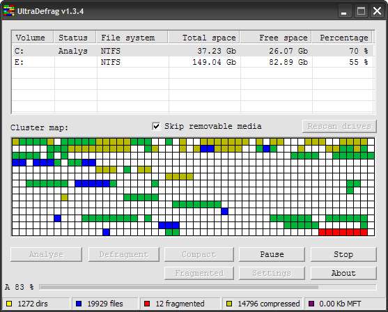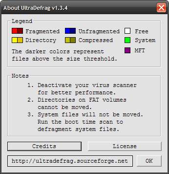De qualquer forma, desde a instalação do XP 64 tenho procurado por aplicativos de 64 bits. Um que eu encontrei é UltraDefrag v 1.3.4 que funcionará com sistemas operacionais de 64 e 32 bits. Este é um aplicativo de código aberto sem frescuras que realiza o trabalho rapidamente. Tal como acontece com o utilitário de desfragmentação nativo do Windows, o UltraDefrag possui um recurso de análise.