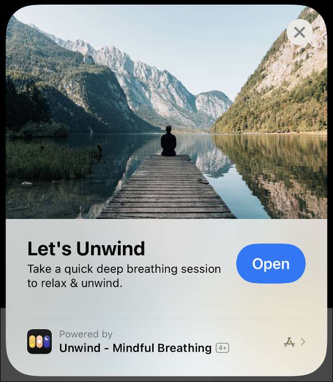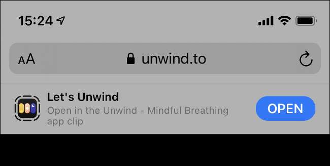 Muitos sites oferecem aplicativos do iPhone de contrapartida que são anunciados no topo da tela sempre que você visitar esse site do seu smartphone. Se um aplicativo suporta clipes de aplicativos, você verá uma opção para "abrir" o clipe do aplicativo no topo, como o Descontrair Mindfulness app, mostrado abaixo.