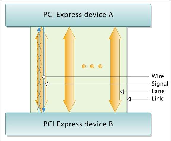 Uma via é simplesmente dois pares de conexões com fio - um par envia dados, o outro recebe dados. Portanto, uma pista PCIe 1x consistirá em quatro fios, 2x terá oito e assim por diante. Quanto mais fios, mais dados podem ser trocados. Uma conexão 1x pode lidar com 250 MB em cada direção, 2x pode lidar com 512 MB, etc.