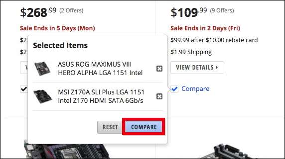 A partir daí, clique em algumas das placas-mãe restantes e marque a caixa “Comparar” abaixo das que parecem boas. Depois de escolher alguns, clique no botão “Comparar” e você poderá compará-los recurso por recurso.