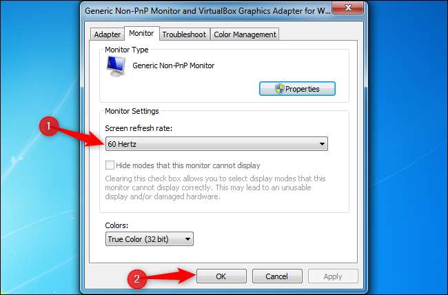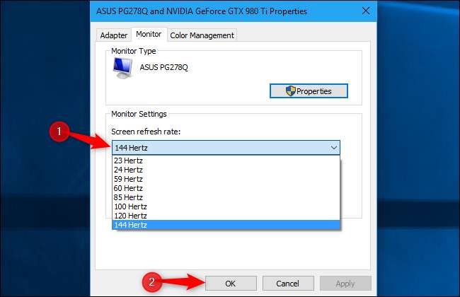 Clique na guia “Monitor” na janela de propriedades que aparece e selecione a taxa de atualização desejada na caixa “Taxa de atualização da tela”. Clique em “OK” para continuar. Sua alteração entrará em vigor imediatamente.
